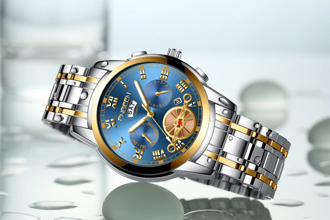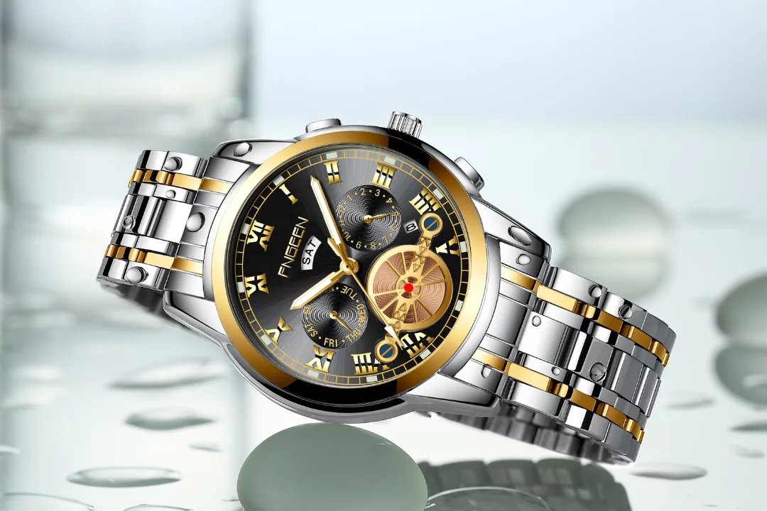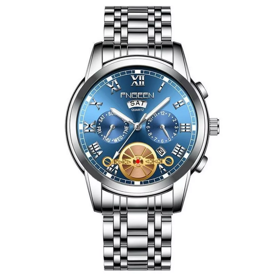 ساعت اوریجینال فنگین زیر مجموعه کمپانی بین باند با ضمانت اصالت کالا طرح سه موتور اسکلتون دو تقویم دارای روزشمار هفته و ماه بند استیل بافت ریز رنگ ثابت ضدآب استخری طراحی فوق العاده خاص و منحصر به فرد عقربه شبنما قاب پشت استیل حک شده ضدزنگ قفل کلیپسی فشاری